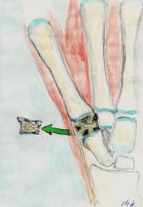 Herausnahme des geschädigten Handwurzelknochens am Daumen und Sehnenaufhängung.